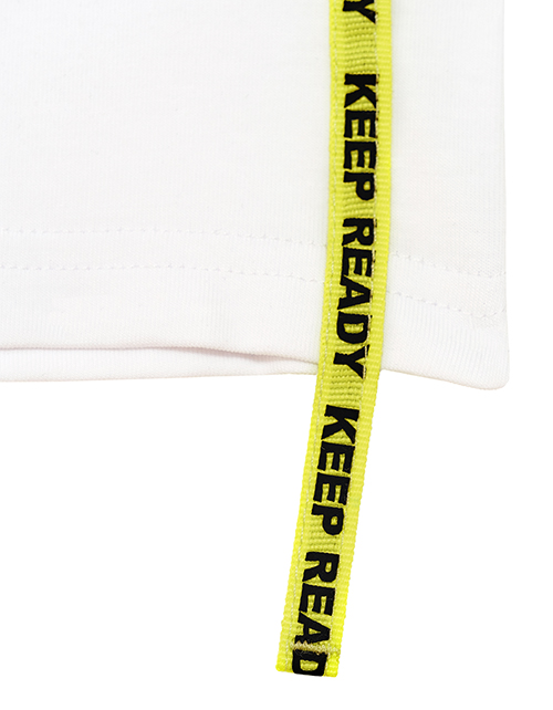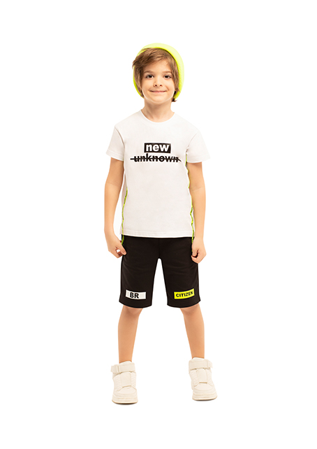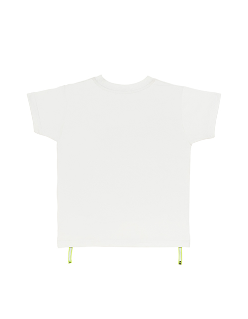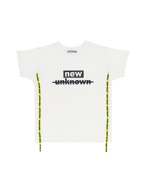 Белая футболка для мальчика прямого силуэта с круглым вырезом горловины. Декоративная тесьма флуоресцентного лимонного цвета вдоль боковых швов. Принт-надпись в стилистике капсулы "Новый мир".