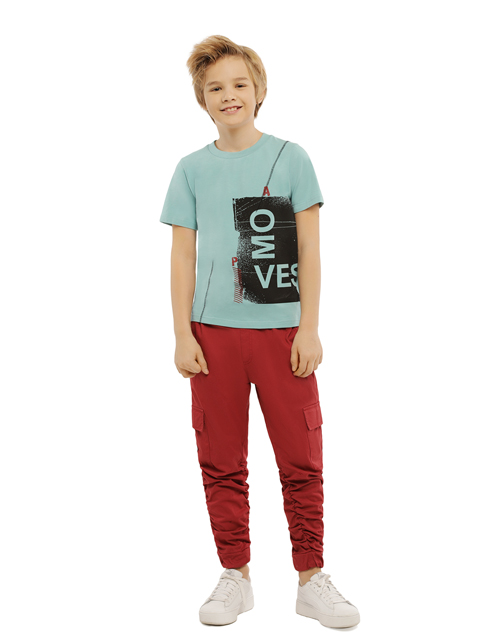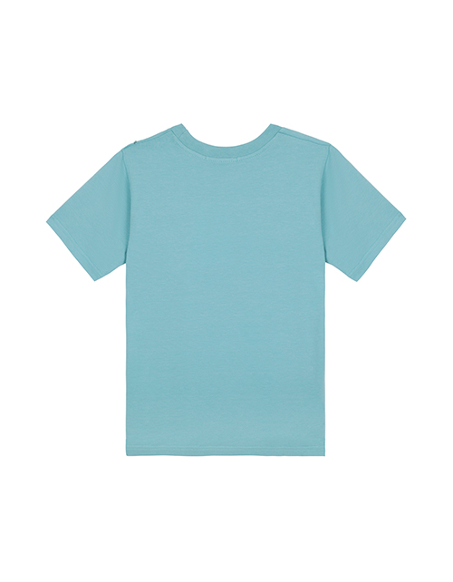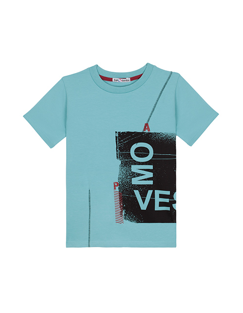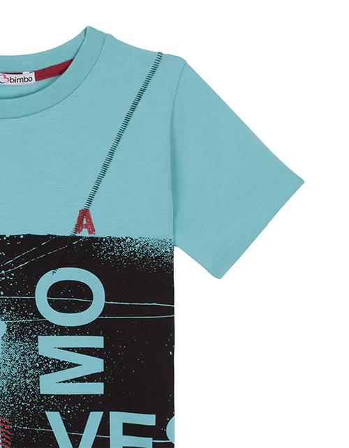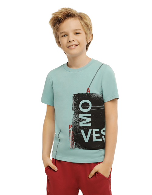 Светло-бирюзовая футболка для мальчика с круглым вырезом горловины из рибаны. Полуприлегающий силуэт. Принт в стилистике капсулы "Городские джунгли".
