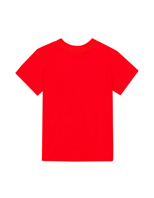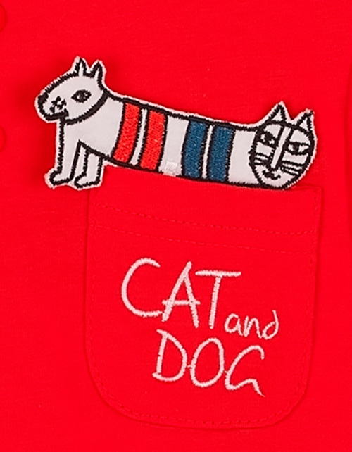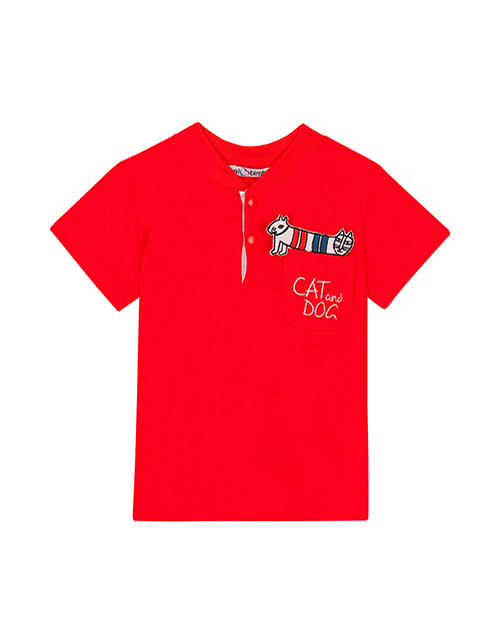 Красная футболка для мальчика с застежкой-поло. Прямой силуэт и накладной карман. Нашивка и принты в стилистики капсулы "Кото-пес".
