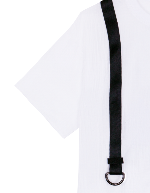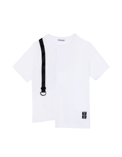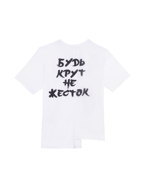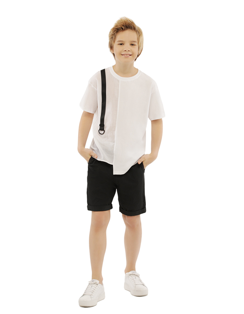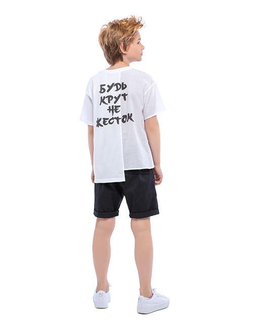 Повседневная футболка для мальчика прямого фасона из ткани кулирная гладь. Короткие рукава и круглый вырез горловины. Принт-надпись на спинке и декоративная вставка из сорочечной ткани. Изделие дополнено контрастным кантом с фурнитурой и нашивкой.