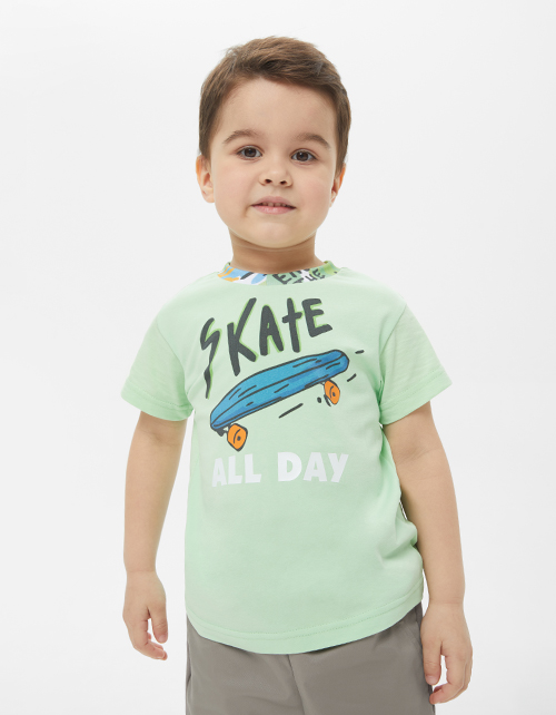 Сочная зелёная футболка для мальчика. Модель прямого силуэта со спущенной линией плеча. Изделие из кулирной глади с авторским принтом.