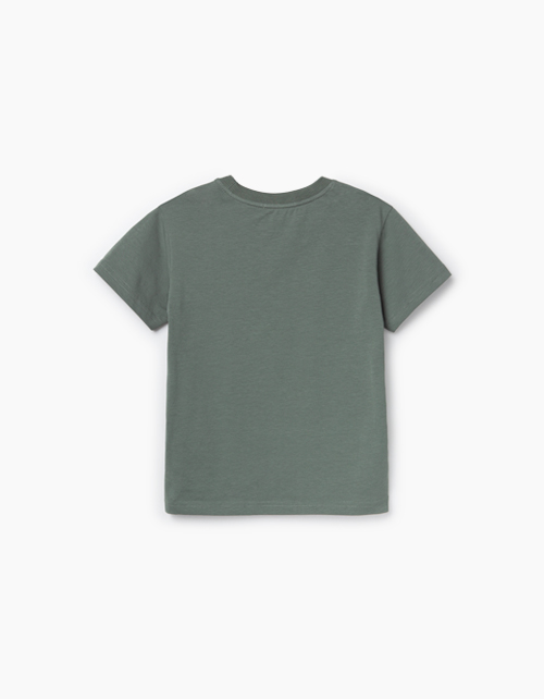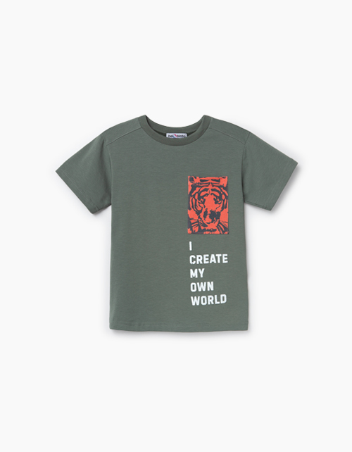 Футболка прямого силуэта для мальчика. Выполнена из кулирной глади цвета хаки. Спереди декорирована нашивкой темно-кораллового цвета с монохромным графическим изображением тигра и контрастной надписью I create my own world ("Я создаю свой мир")