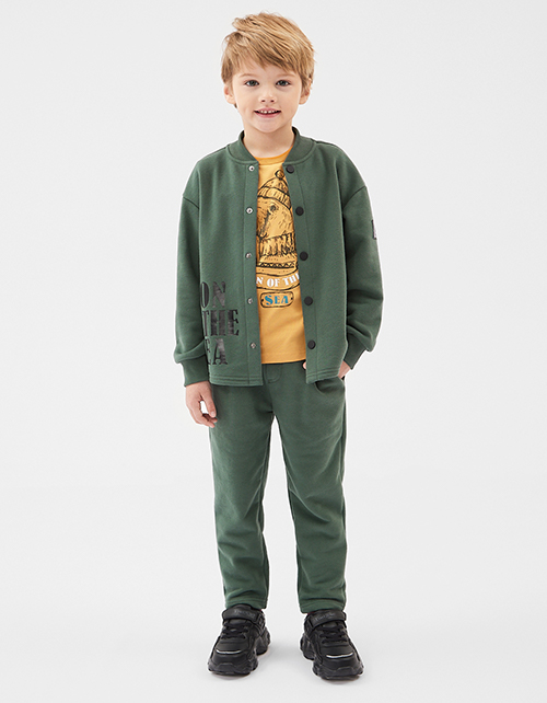 Стильная футболка цвета охра для мальчика. Модель декорирована тематическим принтом.