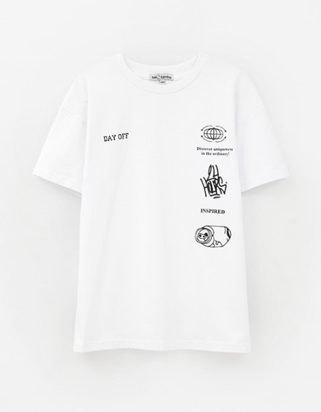 Серая футболка с дизайнерским принтом для мальчика. Модель прямого объёмного силуэта. Эластичная горловина из рибаны.