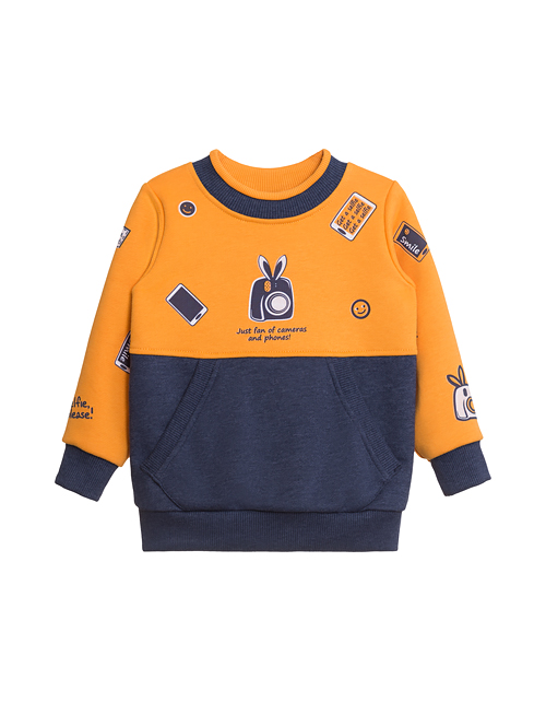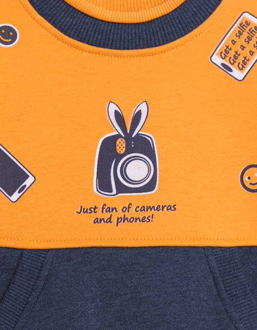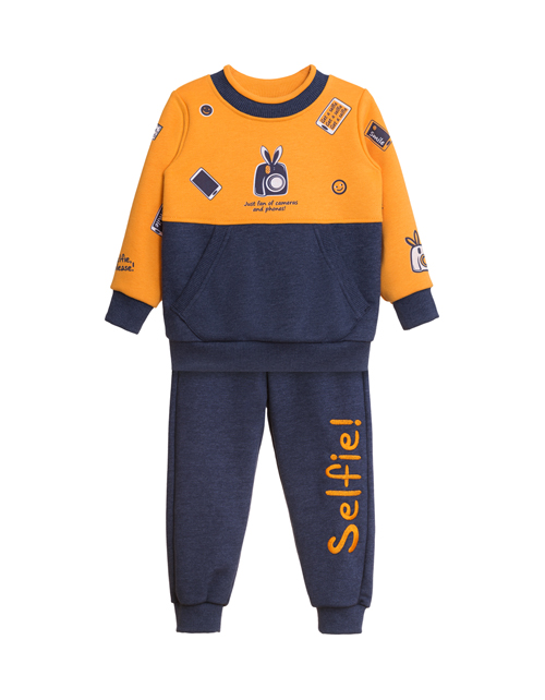 Яркий стильный комплект создан для юного модника! Свободный фасон, актуальная расцветка идеально подойдут для любителя социальных сетей. Толстовка и брюки с нашивками и принтами на тему селфи из мягчайшей ткани подойдут для яркого повседневного образа.