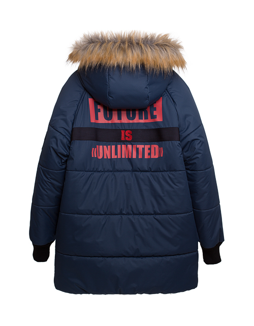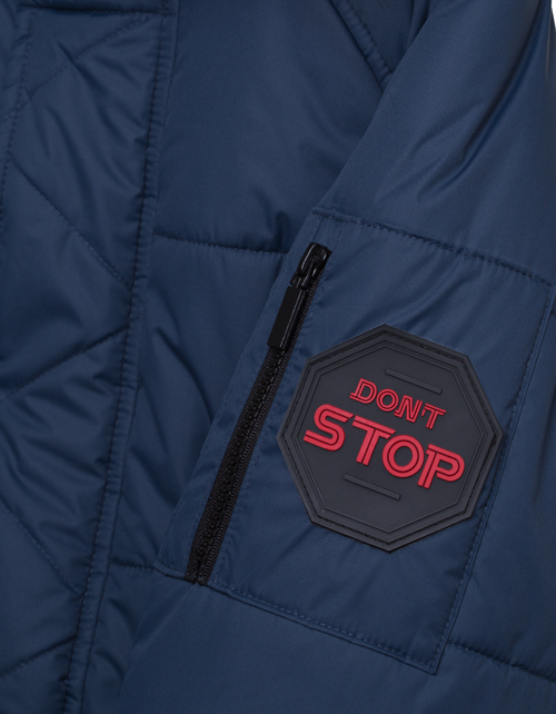 Теплая куртка для мальчика цвета графит с мембранным покрытием. Съемная опушка, ветрозащитная планка. Застежка на молнии и кнопках. Нашивка-лейбл и принт