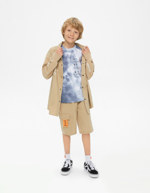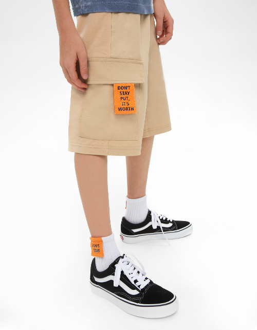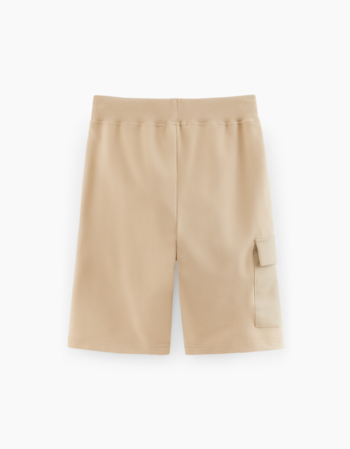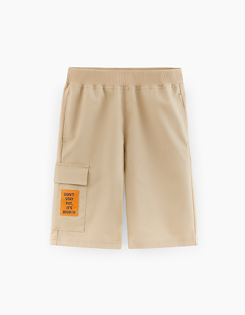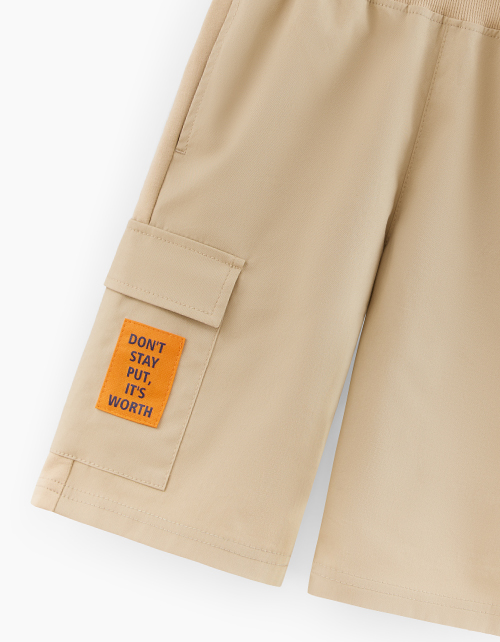 Бежевые шорты для мальчика. Модель прямого силуэта со средней посадкой. Шорты с накладным боковым карманом, без застёжки, на мягком поясе. Модель декорирована нашивкой-лейбой.