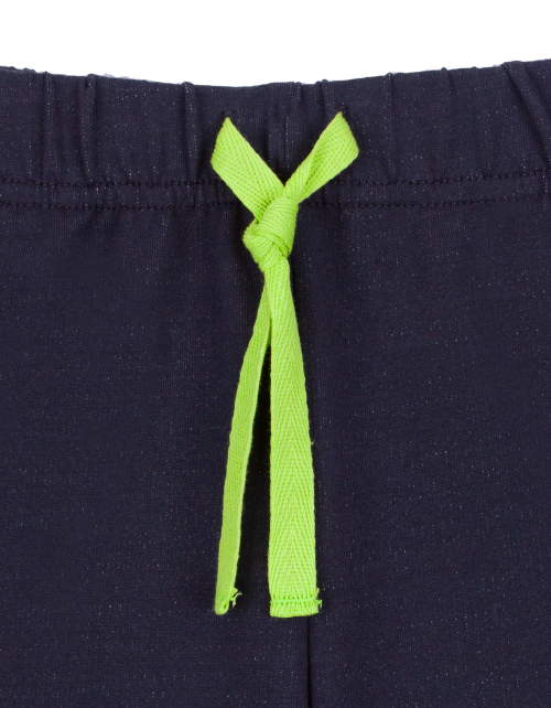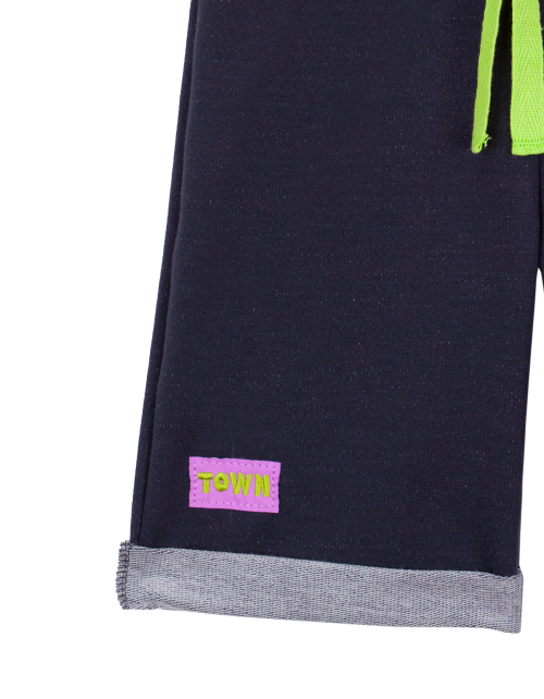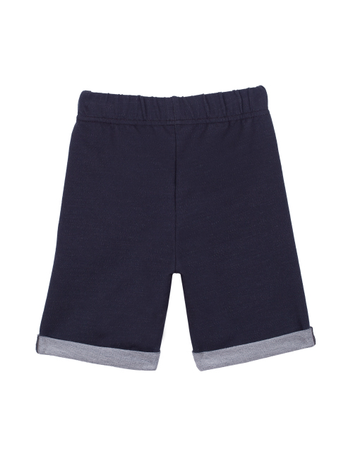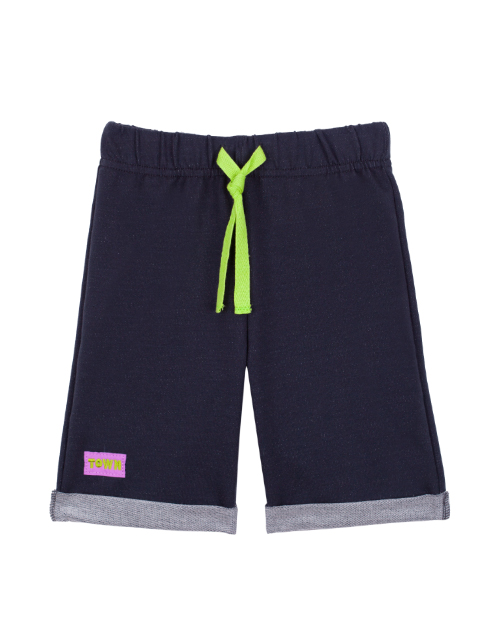 Повседневные бриджи для мальчика прямого силуэта из футера. Пояс на резинке. Изделие дополнено подворотами, контрастным ярким шнурком на поясе и небольшой нашивкой.