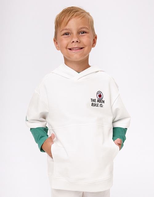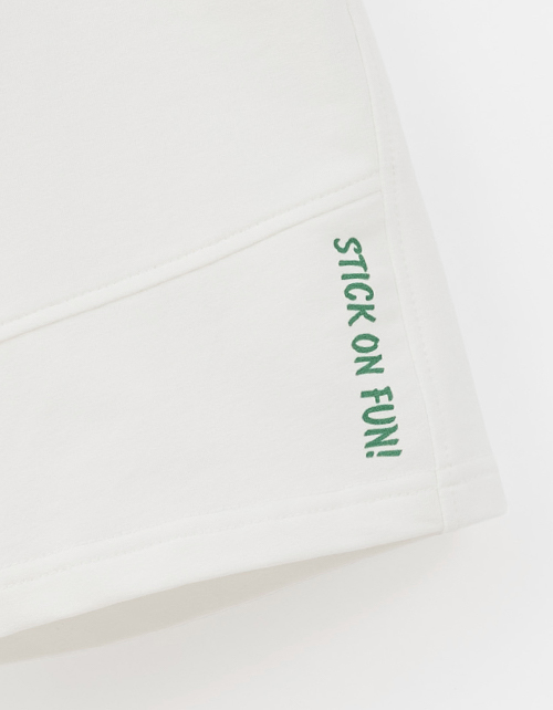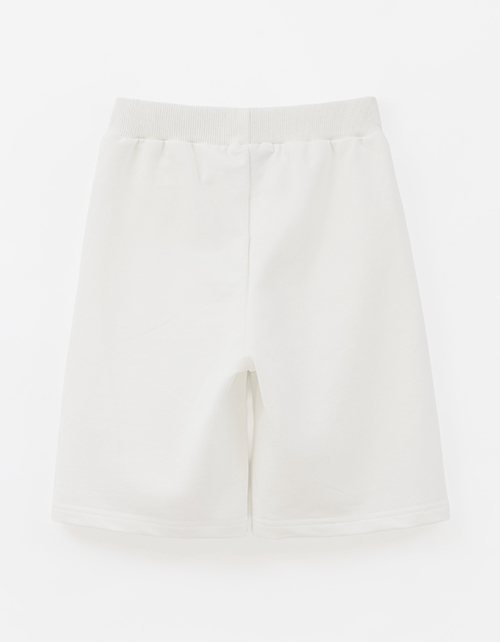 Молочные бермуды выполнены в прямом, широком силуэте и длине ниже колена. Футер делает модель комфортной и держит форму. Мягкий эластичный пояс обеспечивает удобную посадку, а боковые карманы и лаконичная шрифтовая плёнка добавляют аккуратные акценты.