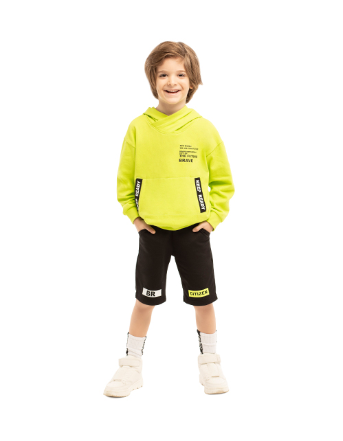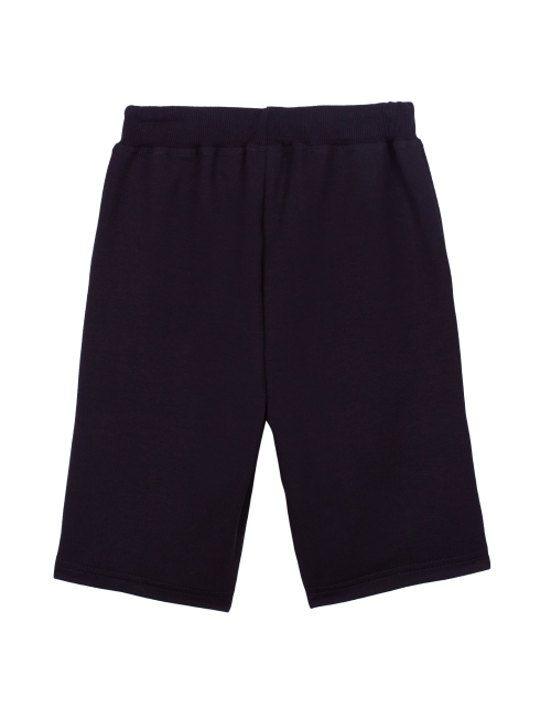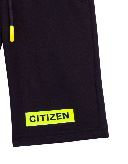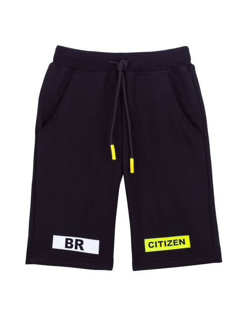 Черные шорты для мальчика прямого силуэта. Эластичная лента на поясе и декоративный шнур для регулировки размера по талии. Дизайнерское оформление в стилистике капсулы "Новый мир".