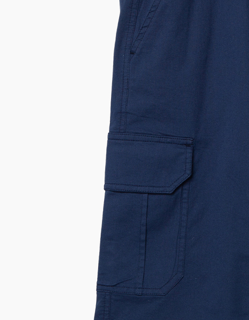 Шорты свободного силуэта в стиле карго для подростка. Из твила синего цвета. Эластичный пояс обеспечивает комфортную посадку по талии. Вместительные карманы делают модель функциональной. Имитация гульфика и кокетка сзади добавляют стильные акценты