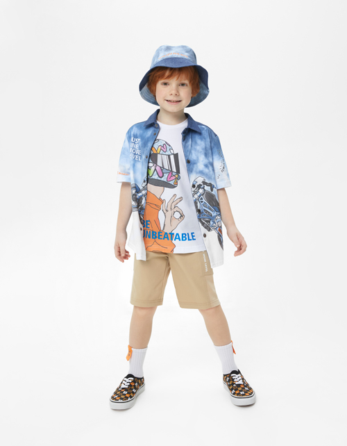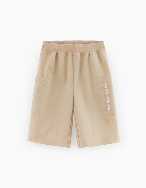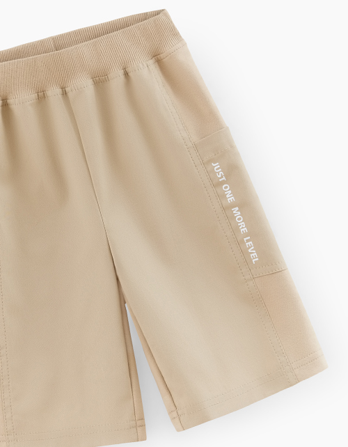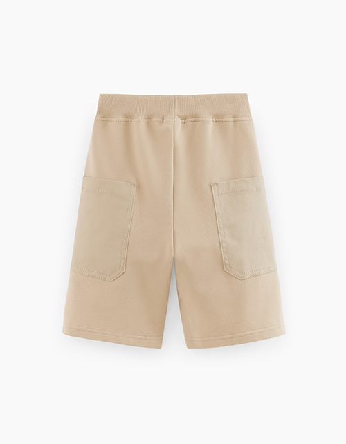 Светло-бежевые шорты для мальчика. Модель прямого силуэта со средней посадкой. Изделие сочетает два вида материала: твил и футер, что придаёт изделию комфорт и удобство. Шорты без застёжки, на мягком поясе, с двумя накладными карманами по бокам.