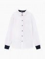 Рубашка прямого силуэта с длинным рукавом для мальчика. Спущенная линия плеча. Застёжка на контрастные кнопки. Накладной карман. Комбинация материалов: тёмно-синяя кулирная гладь и белая сорочечная ткань. Авторский принт. Строго соблюдайте правила ухода!