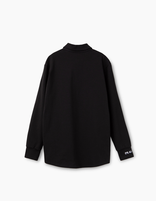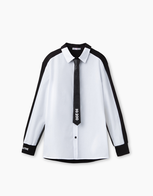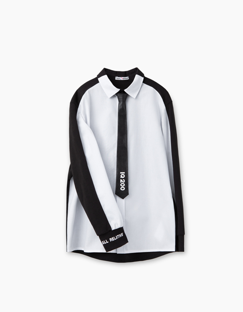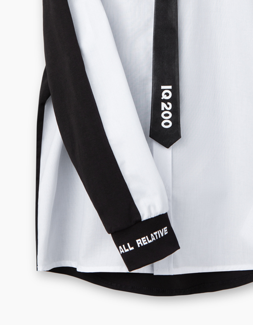 Черная рубашка с прямым силуэтом. Застегивается на пуговицы. Комбинируется из двух видов ткани -оксфор и кулирной глади. На манжете - надпись "It's all relative". В комплекте - съемный галстук из эко кожи с надписью "IQ200".