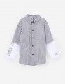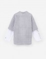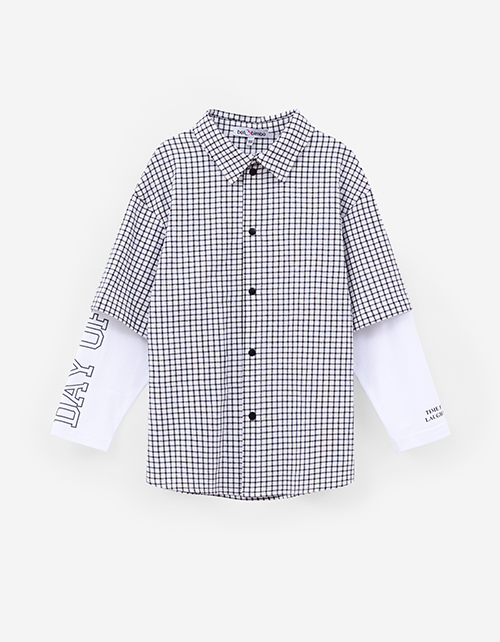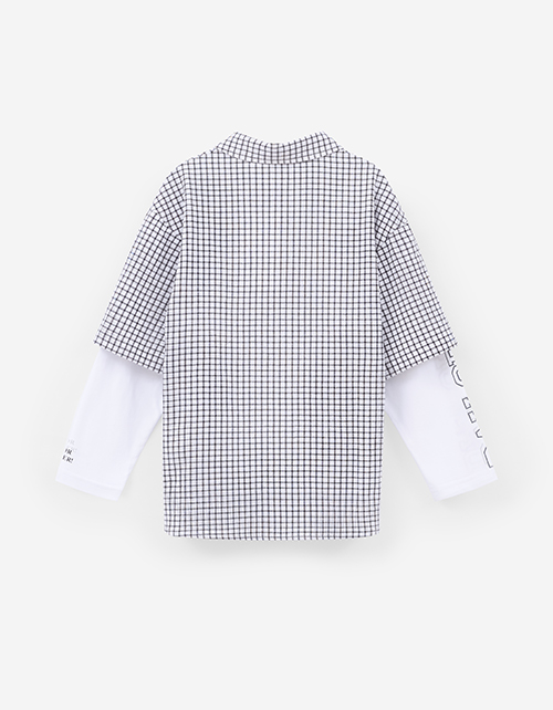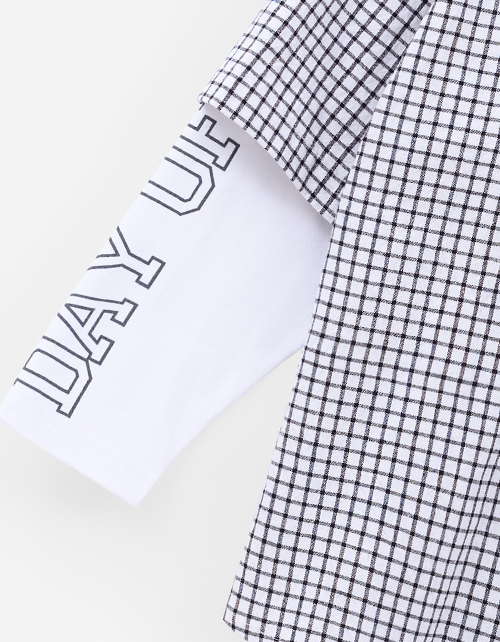 Модель в клетку с прямым кроем выполнена в стиле имитации лонга и рубашки. Длинный рукав из кулирки и короткий из основной ткани создают многослойный эффект. Жатая сорочечная ткань и принт с термотрансфером подчёркивают современный, расслабленный стиль.