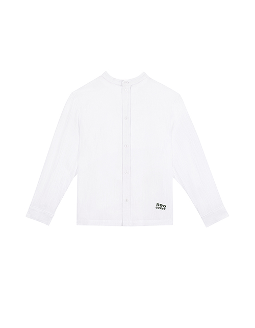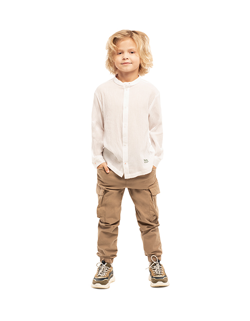 Белая сорочка для мальчика прямого свободного силуэта. Застежка на петли-пуговицы, воротник-стойка. Дизайнерское оформление в стилистике капсулы "Нео сафари".