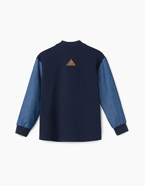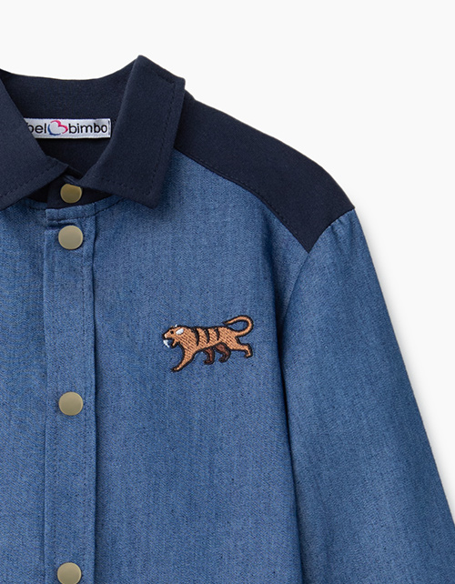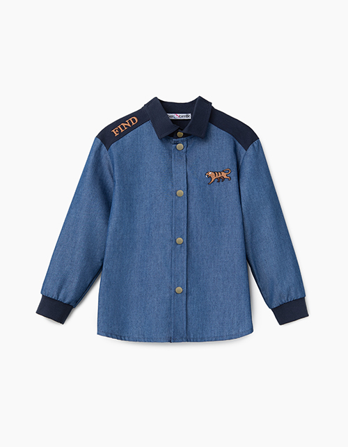 Сорочка прямого силуэта из голубого сорочечного джинса и темно-синей кулирки с начесом. Застежка на кнопках. Манжеты рукавов из рибаны. Вышивка на правом плече и на груди слева. Декоративная треугольная нашивка на спине