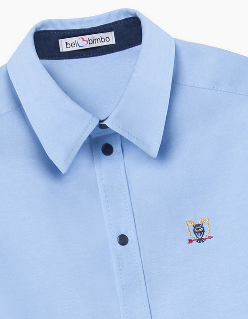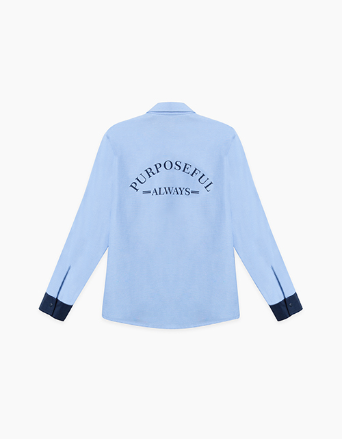 Светло-голубая рубашка классического прямого силуэта. Модель с длинным рукавом. Темно-синие манжеты, застежки-книпперы и отделка на внутренней стороне воротника. Рубашка декорирована фирменной эмблемой и контрастным текстовым принтом