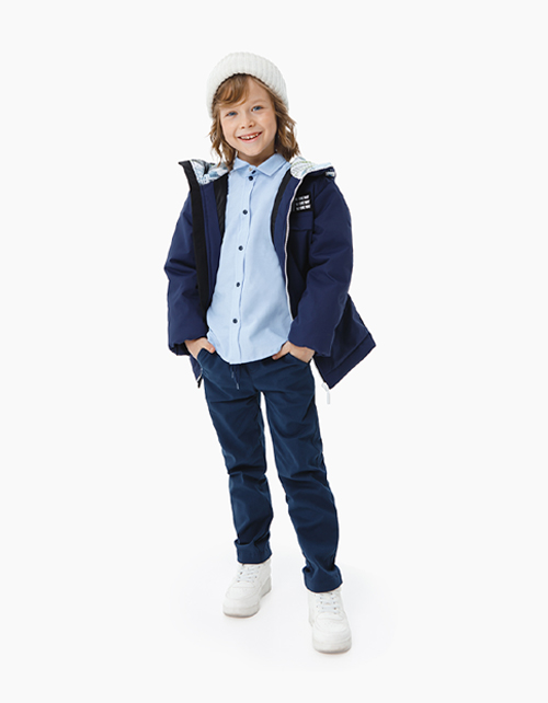 Светло-голубая сорочка свободного силуэта. Выполнена из сорочечной ткани, с эластичными манжетами из рибаны. Застежка на книпперы черного цвета. Декорирована контрастными текстово-графическими принтами в тематике капсулы на манжетах и на спинке