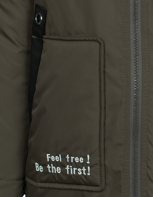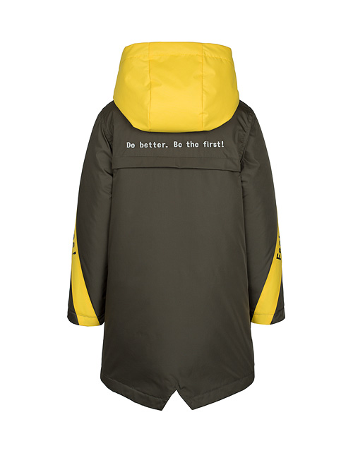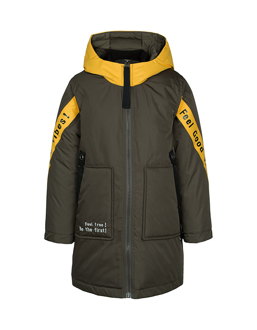 Куртка для мальчика на синтепоне прямого силуэта дополнена контрастным по цвету капюшоном, двумя большими накладными карманами, принтами в виде надписей и удобной застежкой на молнии. Подкладка из флиса и нейлона гарантирует комфорт в носке.