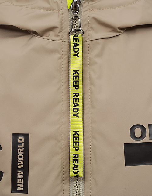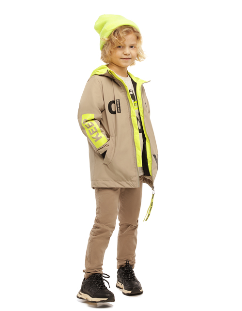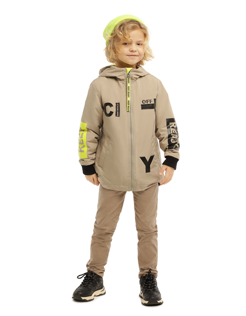 Бежевая куртка для мальчика. Объемный силуэт, разрез на спинке. Рукава с манжетами на резинке. Карманы на лицевой стороне. Застежка на молнии с яркой дизайнерской лентой.