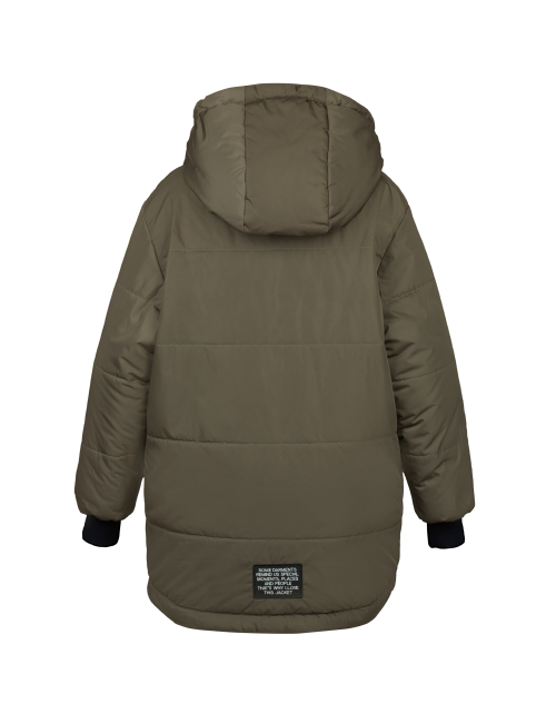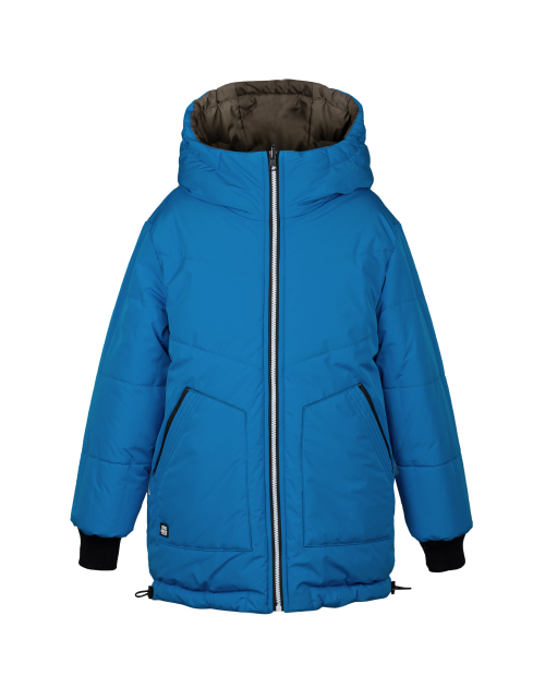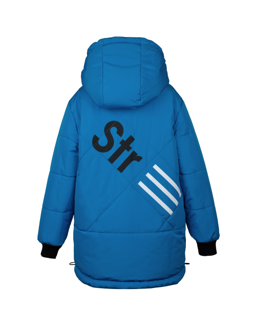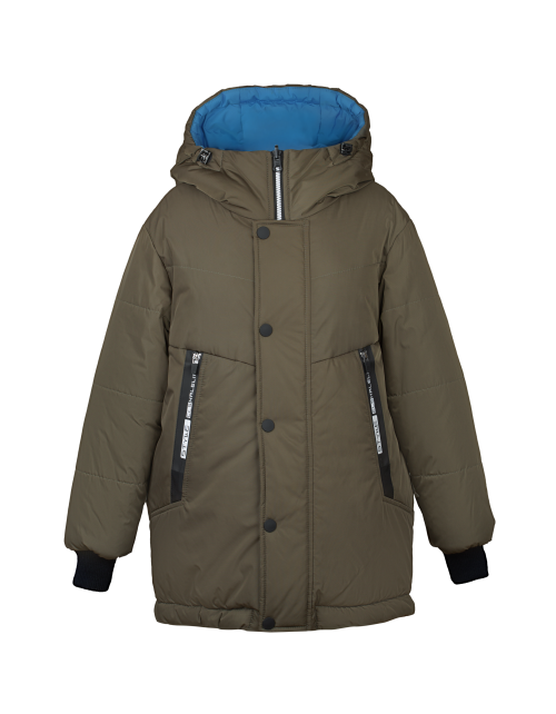 Теплая куртка для мальчика на синтепоне имеет прямой силуэт, дополнена капюшоном, застежкой на молнии, контрастными манжетами и стильным принтом на спине. Двусторонняя куртка пошита из ткани добби, а изнутри выполнена из матовой плащевой дьюспо.