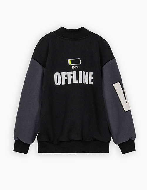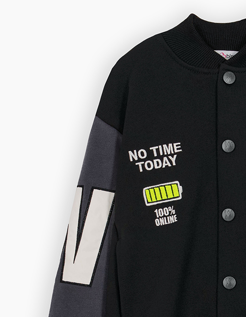 Стильный чёрный бомбер для мальчика. Прямая объёмная модель с контрастными рукавами. Воротник-стойка и низ изделия из рибаны. Бомбер на удобных кнопках. Изделие декорировано вышивкой с аппликацией.