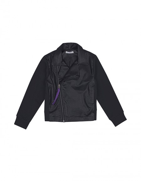 Жилет прямого силуэта, с V-образным вырезом и застежкой на книпперы. Выполнен из черного футера с отделкой из рибаны по вороту, пройме и низу. Декорирован фирменной эмблемой и принтом Always be purposeful ("Всегда стремись к цели") на подкладке