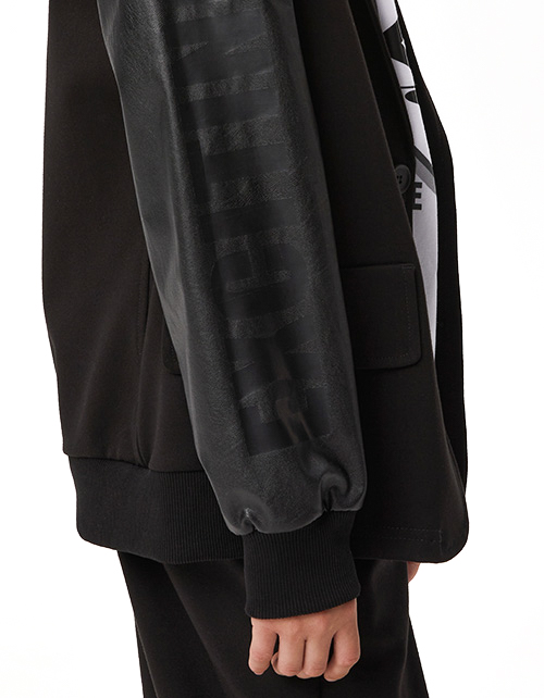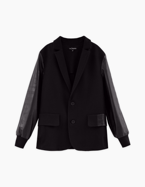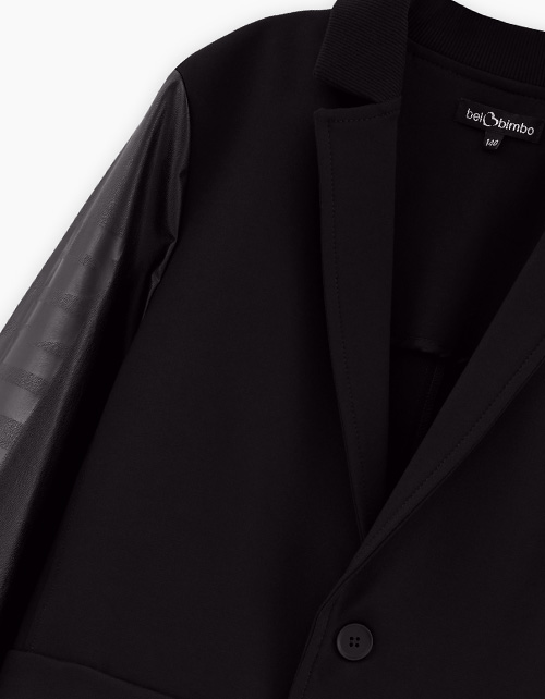 Оригинальный пиджак для мальчика. Модель прямого силуэта. Отложной воротник с лацканами. Манжеты и низ изделия по спинке из эластичной рибаны. Имитация карманов Комбинация материалов: трикотажное полотно и эко-кожа. Застёжка на пуговицы. Авторский декор.
