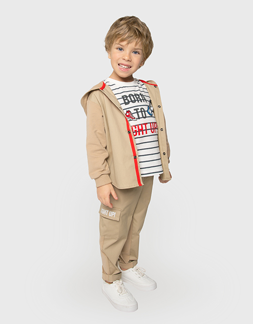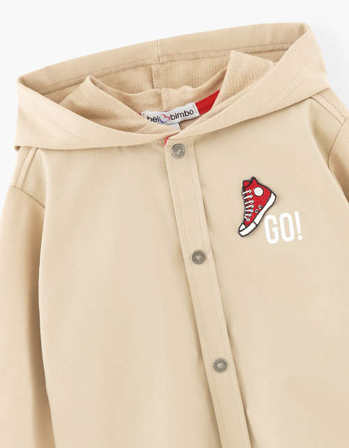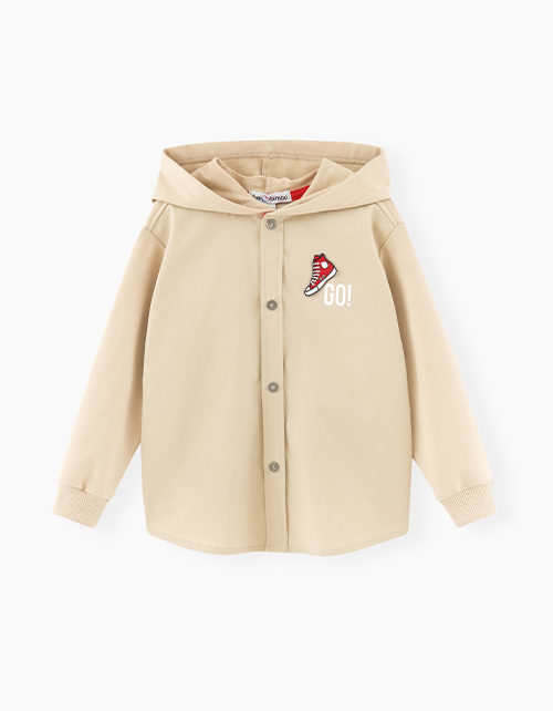 Стильный жакет-рубашка для мальчика. Выполнен из комбинации трикотажа с браш-эффектом и твила. Застежка на кнопки.