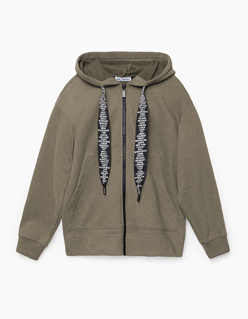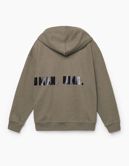 Свободная толстовка с удобным капюшоном с декоративной регулирующей тесьмой. Выполнен из меланжевого футера цвета хаки с отделкой из рибаны. Декорирован контрастным слоганом на спинке, выполненным в технике термотрансфера.
