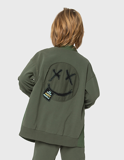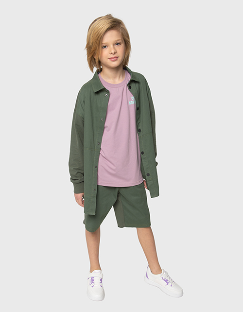 Стильная рубашка цвета хаки для мальчика. Уютная модель из трикотажного полотна с браш-эффектом. Застежки на кнопки и карман-кенгуру.