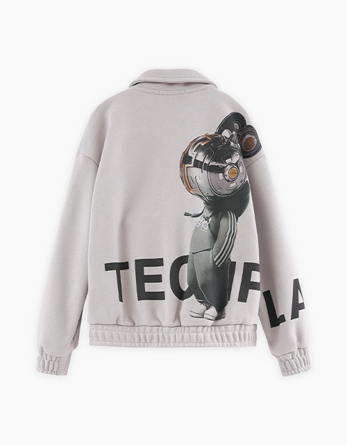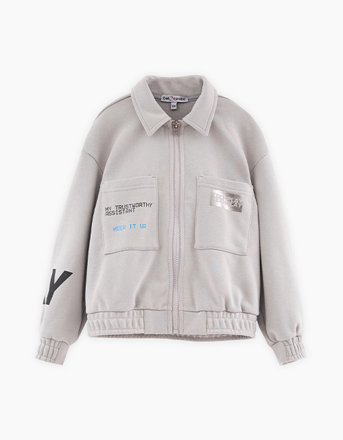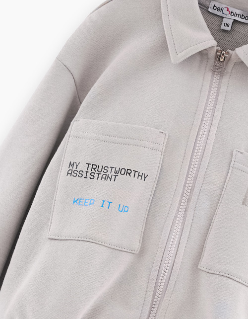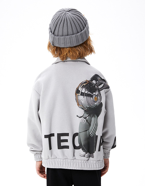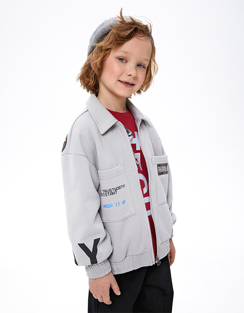 Светло-серый жакет-куртка для мальчика. Модель прямого объёмного силуэта с приспущенной линией плеча. Манжеты и низ изделия с эластичной лентой внутри. Комфортная застёжка на молнию. Жакет из материала с браш-эффектом декорирован авторским принтом.