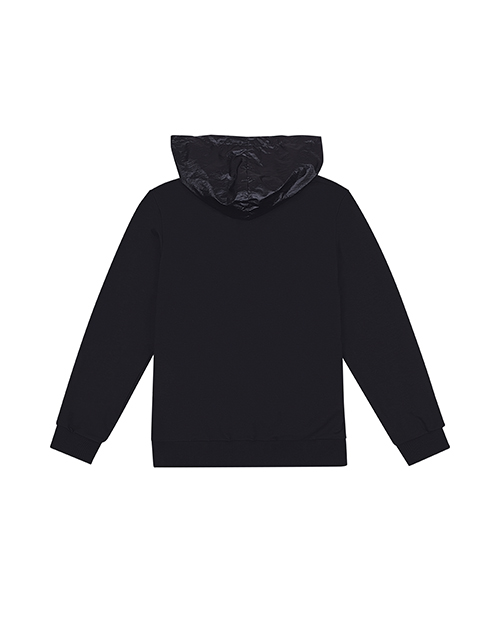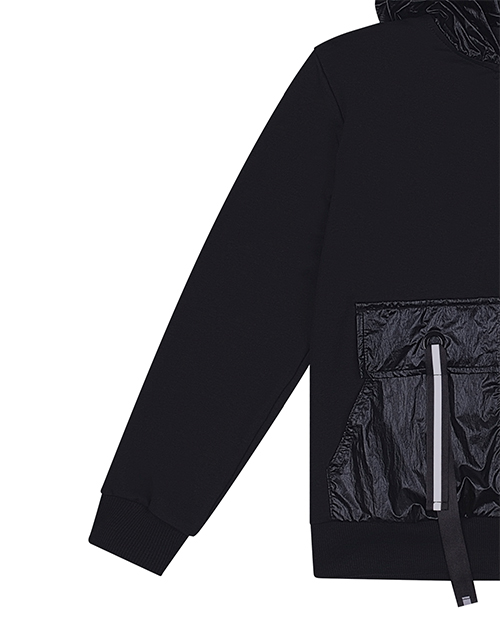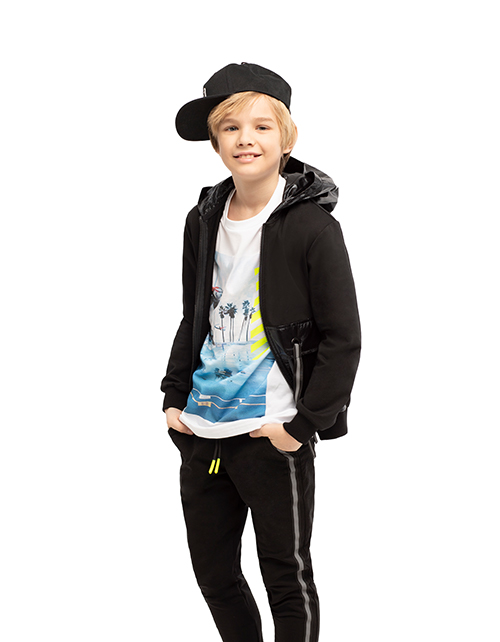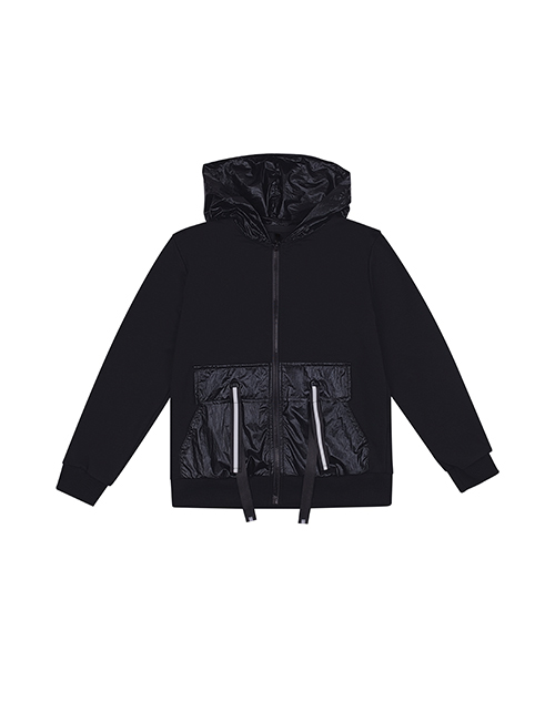 Черный жакет для мальчика с застежкой на молнию. Объемная форма, капюшон и карманы-кенгуру. Эластичный пояс и манжеты из рибаны. Люверсы и репсовая лента на карманах. Оформление в стилистике капсулы "Уличный движ".