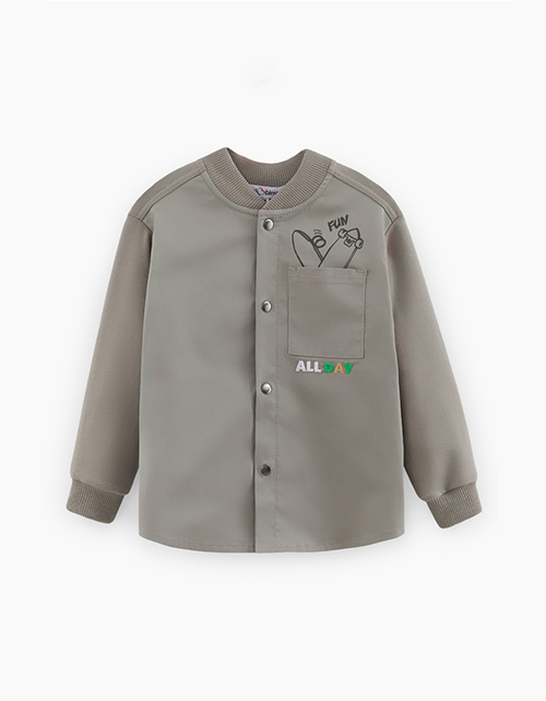 Стильный серо-коричневый жакет-рубашка для мальчика. Модель прямого силуэта. Изделие из комбинации материалов: футер и твил. Жакет декорирован акцентным авторским принтом на спинке.