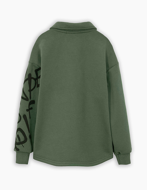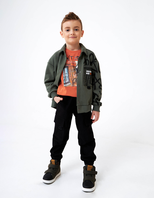 Жакет-рубашка в трендовом оттенке листа шалфея для мальчика. Авторский принт в стиле граффити. Жакет на кнопках, с отложным воротником и накладным карманом. Рибана по низу спереди, спинка изделия - рубашечного типа. Модель из футера с браш-эффектом.