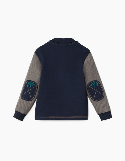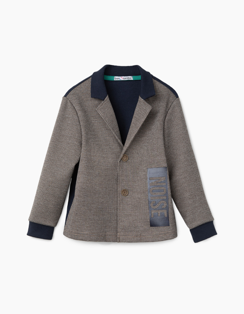 Жакет свободного прямого силуэта из трикотажного полотна и футера, с манжетами из рибаны. Застежка на кнопки. Декорирован вышивкой на рукавах, принтом NOISE ("ШУМ") спереди и контрастной киперной тесьмой по воротнику