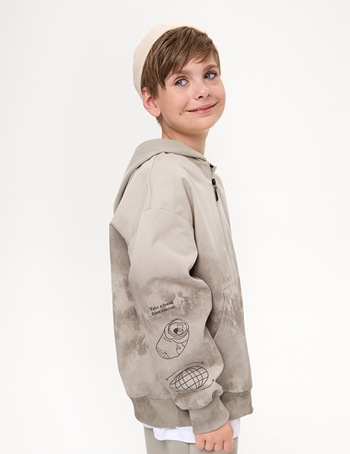 Зип-худи для мальчика. Модель прямого силуэта из твила и мягкого футера с браш-эффектом с объёмным низом на рибане - удобная и практичная. Капюшон и карманы-кенгуру добавляют комфорта, застёжка на молнию. Дополнен авторским цифровым принтом.