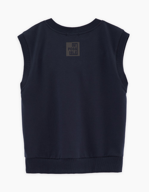Стильный тёмно-синий школьный жилет для мальчика. Модель прямого силуэта. Спущенная линия плеча. V-образный вырез горловины. Деликатный авторский принт на спинке и скрытый на ленте. Комфортное изделие из футера станет отличной базой гардероба школьника.