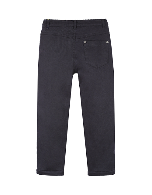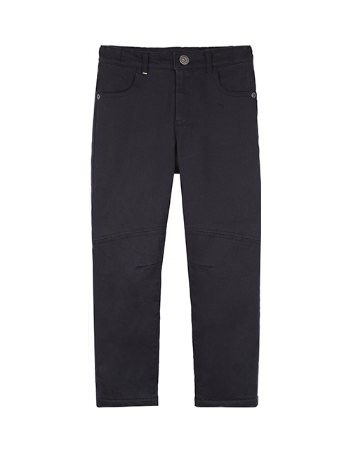 Темно-синие брюки для мальчика имеют зауженный крой, застежку на молнии с пуговицей, два внутренних и один накладной карман сзади. Брюки пошиты из твила, что гарантирует износостойкость изделия. Подкладка на флисе дарит дополнительное тепло и комфорт.