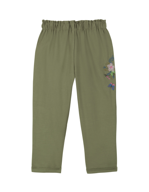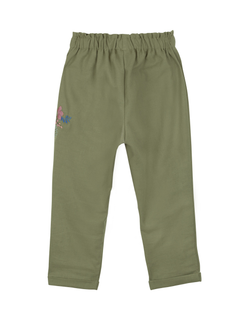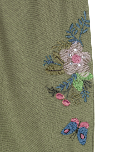 Повседневные брюки для девочки свободного фасона из хлопчатобумажной ткани. Пояс на резинке с защипами. Декоративная вышивка в левой части изделия.
