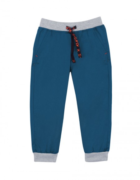 Повседневные брюки для мальчика свободного силуэта серого цвета. Пояс на резинке дополнен контрастным шнурком. Два кармана спереди и накладной карман в задней части. Изделие дополнено манжетами и стильными нашивками.