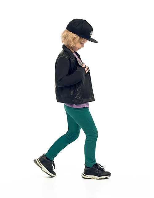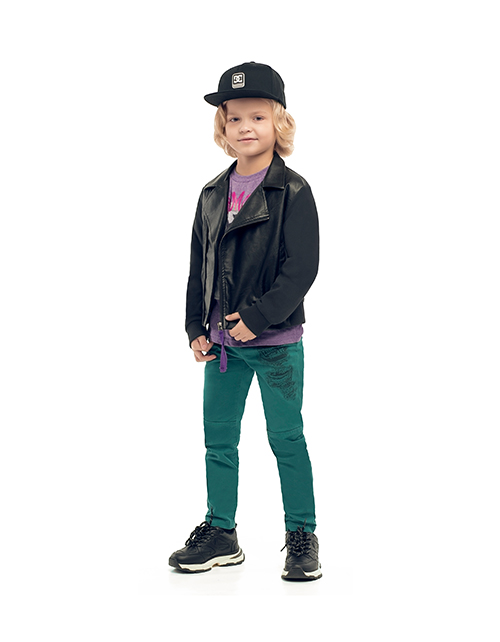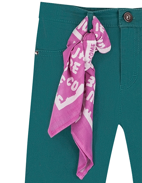 Брюки для мальчика изумрудного цвета. Регулировка пояса на эластичную ленту с петлями и пуговицами. Функциональные карманы. Бандана цвета фуксии крепится к шлевке изделия. Дизайнерское оформление в стилистике капсулы "Дружище Бакс".