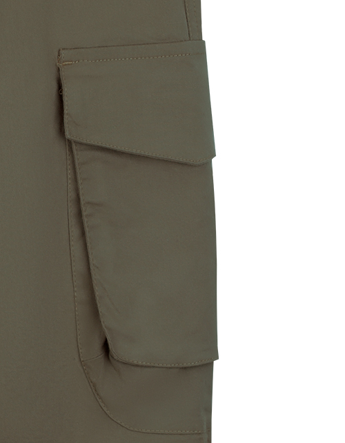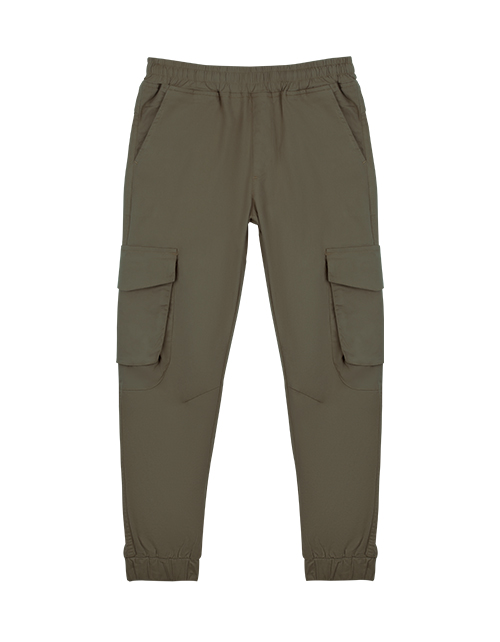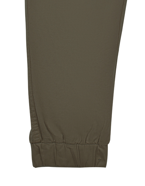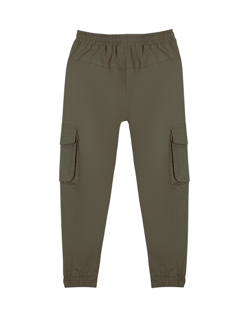 Оливковые брюки-джоггеры для мальчика свободного силуэта. Накладные карманы через боковой шов. Пояс и манжеты на резинке.