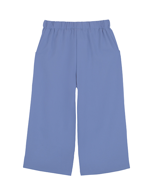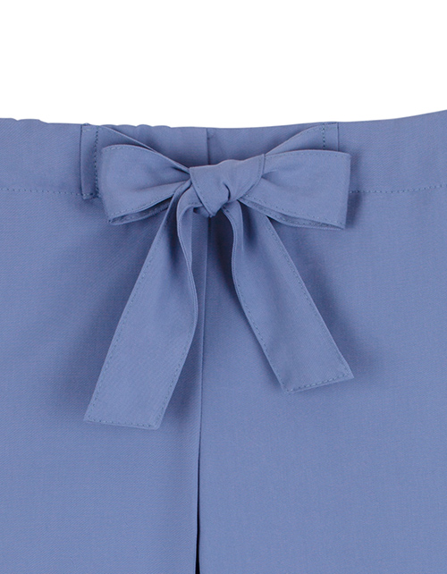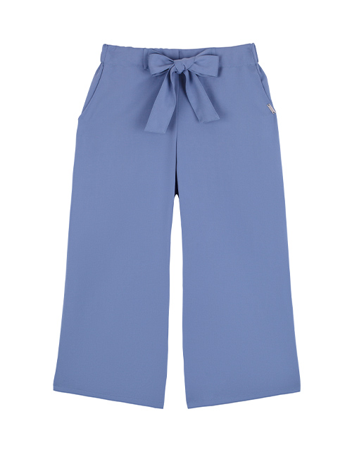 Брюки-кюлоты для девочки цвета деним свободного силуэта. Эластичная талия с завязывающимся бантом по переду. Функциональные карманы. Оформление в стилистике капсулы "Чаепитие в саду.