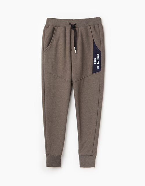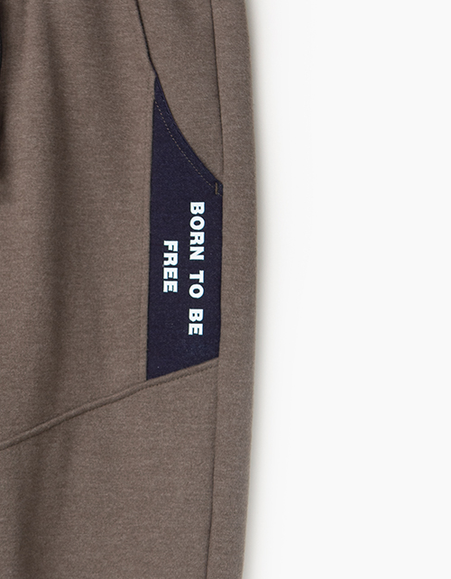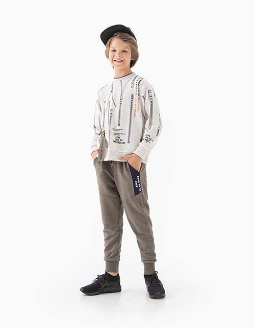 Брюки спортивного силуэта для мальчика. С манжетами из рибаны. Из меланжевого футера цвета хаки. Мягкий пояс регулируется шнуром. Декоративные подрезы спереди. По левому бедру вставка из ткани под джинс с принтом