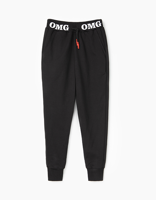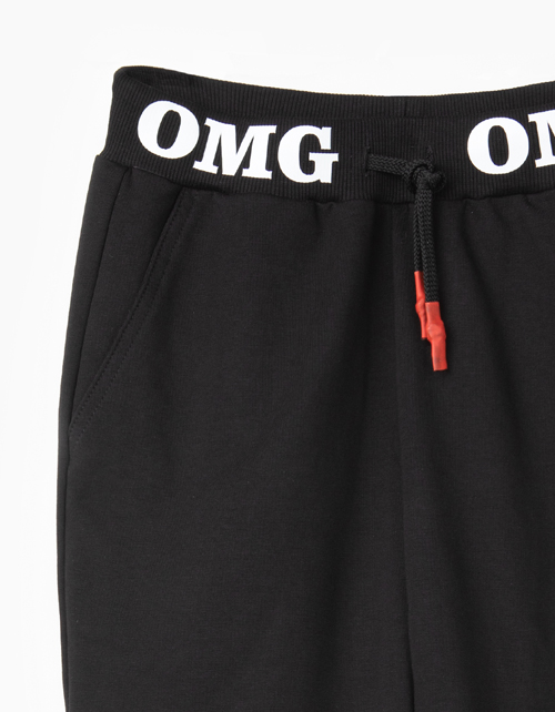 Спортивные брюки с манжетами для мальчика-подростка. Пошиты из черного футера. Пояс с затяжкой на шнурок выполнен из черной рибаны с контрастным дизайнерским принтом. Функциональные карманы спереди.