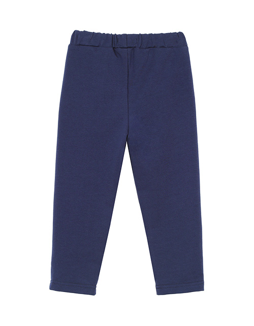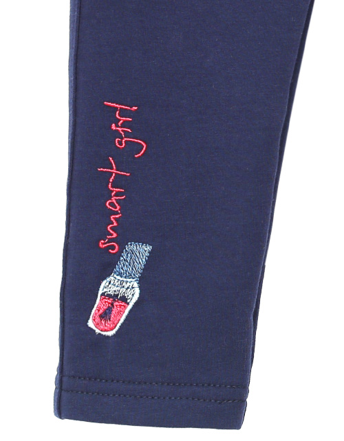 Темно-синие брюки для девочки в спортивном стиле дополнены удобной резинкой на поясе и стильным небольшим принтом с надписью. Трикотажная ткань футер подарит комфорт в носке и выдержит множество стирок.
