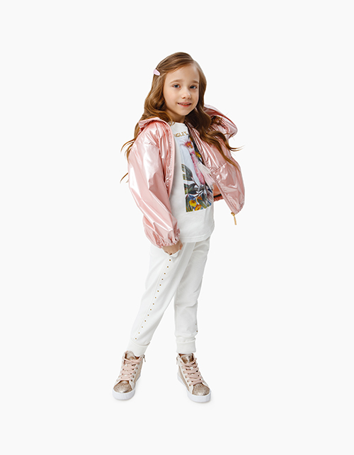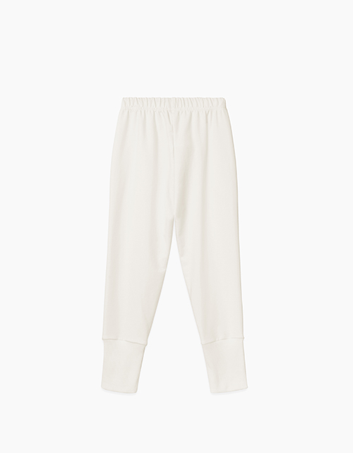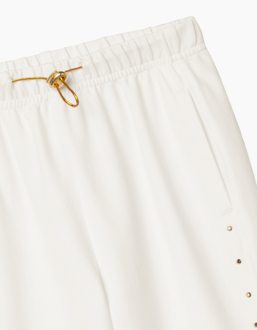 Молочные брюки-джоггеры с высокими манжетами из кулирной глади. С прорезными карманами по бокам сверху. Декорированы металлизированными стразами вдоль перенесенных боковых швов и люрексовым шнуром с золотистым карабином, регулирующим обхват по талии