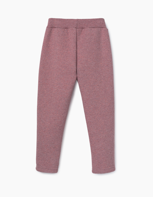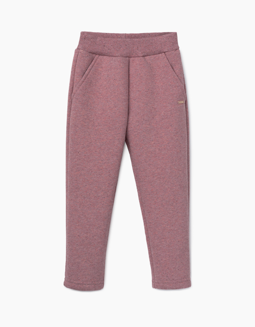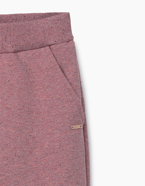 Брюки комфортной посадки из темно-розового меланжевого футера. С карманами спереди. Декоративная металлическая нашивка на левом кармане. Эластичный пояс из рибаны в тон основной ткани.